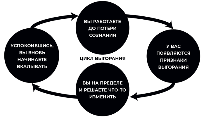 Чтобы справиться с выгоранием, нужно тратить свое время и энергию на то, что помогает от него защититься, но именно этих двух вещей людям с выгоранием обычно не хватает. Чем сильнее мы выгораем, тем меньше остается времени на досуг, и это вполне естественно: если вы все силы вкладываете в работу и другие обязательства, не стоит удивляться, что все хорошее исчезает из вашей жизни. Мы непременно заплатим за время и энергию, которые потратили на реализацию своих целей, в ущерб здоровью, отдыху и отношениям с близкими, — и заплатим сполна.