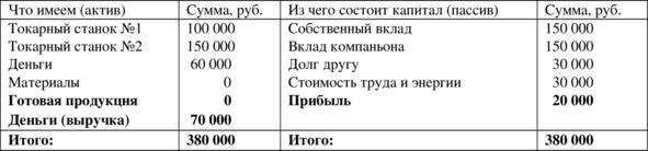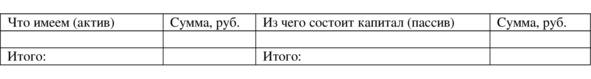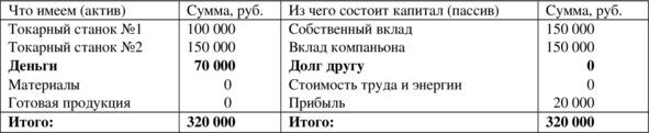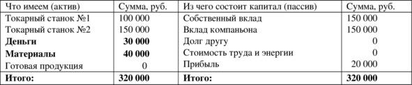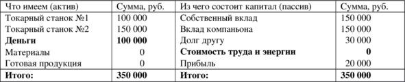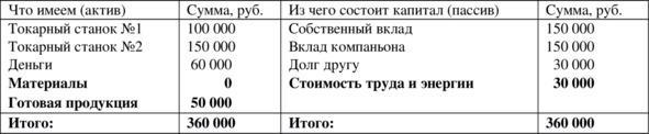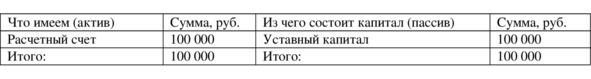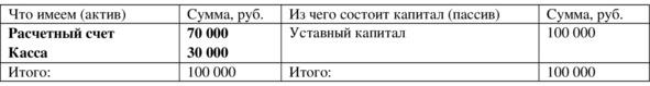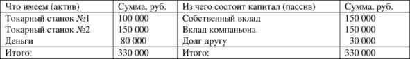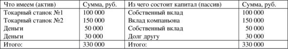 150 000 рублей. Ещё 30 000 рублей вы заняли у друга. Таким образом, у вас есть первоначальный капитал (100 000 +50 000 +150 000 +30 000) = 330 000 рублей. Очень упрощенный вариант бухгалтерского баланса можно представить в виде таблицы 1.1.
