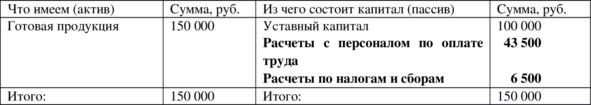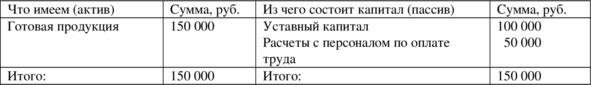 Теперь предположим, что из материалов вы изготовили готовые изделия — матрешки. Теперь материалы стали произведенной продукцией. Стоимость затраченных материалов 20 000 рублей. Но был еще затрачен труд (токарные работы, художественные работы), была затрачена электроэнергия на работу станков и на освещение помещений и т. п. Предположим, что это увеличивает стоимость готовых изделий ещё на 30 000 рублей. Тогда на момент готовности продукции (20 000 +30 000) = 50 000 рублей баланс будет иметь следующий вид.