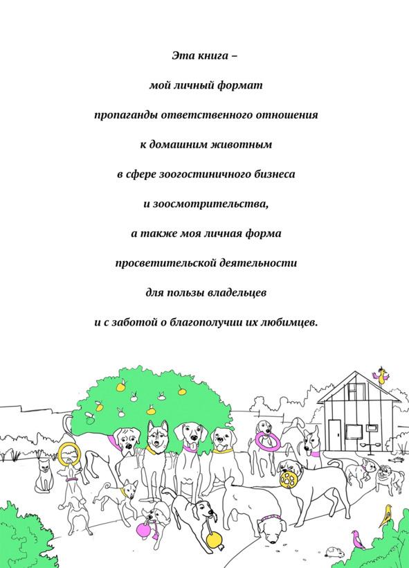 Моя задача помочь Вам с помощью книги, которую Вы держите в руках, научиться ориентироваться и в сфере услуг для домашних животных, которые предоставляют Вам возможность путешествовать, принимая Ваших любимцев на временное проживание. Уметь грамотно принимать решение при выборе зоогостиницы, передержки, зооняни. Моя задача познакомить Вас с нюансами выбора и других сервисов, призванных сделать жизнь Вашу и Вашего любимца более насыщенной событиями и совместными интересными делами.