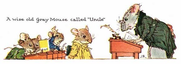 Grasshopper Green improved so rapidly that by the time the young mice got home from school he was well enough to get up. I forgot to tell you that Long-Tail, Sharp-Eyes, Pink-Ears and Mouseykins were taught by a wise old grey mouse whom they called "Uncle." "Uncle" lived in a nice stone house, a hole in the foundation of a ruined barn, near-by.