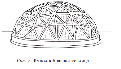 Данную разновидность уместно использовать на открытом месте, поскольку конструкция более устойчива к порывам ветра, чем обычные теплицы. Благодаря многоугольным стеклам обеспечивается великолепное освещение (рис. 7). Конструкция особенно эффектна снаружи, возвышаясь над заснеженным участком куполом живой зелени и цветов.