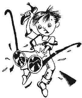 Этот прием особенно подходит для тех, кто из-за очков прибрел эмоциональные раны, такие как комплекс неполноценности, неуверенность и разочарование в себе. Этим людям предлагается взять кувалду, молоток или туфли с острыми каблуками и с их помощью отомстить очкам за все свои негативные переживания, за годы унижений, страданий и обид. Ребенок может делать это самостоятельно или вместе с вами. При этом нужно не просто колотить по стеклам, а ругать и проклинать «тюремщиков», поработивших глаза на много лет. После этого нужно дать зарок самому себе обходиться без очков (рис. 1).