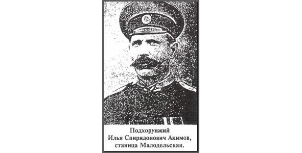 АКИМОВ Илья Спиридонович — (Казак станицы Молодельской, Усть-Медведицкий округ, ОВД) — 17 Донской каз. генерала Бакланова полк, 1 сотня, подхорунжий. Произведен в офицеры из вольноопределяющихся Донского казачьего войска 1917. В Гражданскую войну воевал в Донской армии. Зам. командира, а затем и командир 3 казачьего полка Усть-Медведицкой кав. дивизии. Сотник. и подъесаул с 10 ноября 1919. 18 августа 1919 года командир 29 казачьего полка. с весны 1920 в Донском офицерском резерве и Донском офицерском полку до эвакуации Крыма. Есаул с 6 декабря 1920 года. Был на о. Лемнос. Осенью 1925 в составе Донского офицерского резерва в Болгарии. Номер Георгиевского креста 1 ст. не установлен. Георгиевский крест 3 ст. №92560 «Пожалован от Имени Его Императорского Величества в память годовщины войны, как особо отличившийся в настоящую войну своей храбростью, мужеством и лихостью». « В память годовщины войны Государю Императору благоугодно было пожаловать Георгиевский крест, для награждения его, особо отличившегося в настоящую войну, своей храбростью, мужеством и лихостью. (Приказ 4 кавалерийского корпуса за №27 от 28. 01. 1916 г.). Награждён ГК 4 ст. №191687: «За отличия, оказанные в делах против неприятеля». [III-92560] Имеет Георгиевские кресты [IV-190687] *