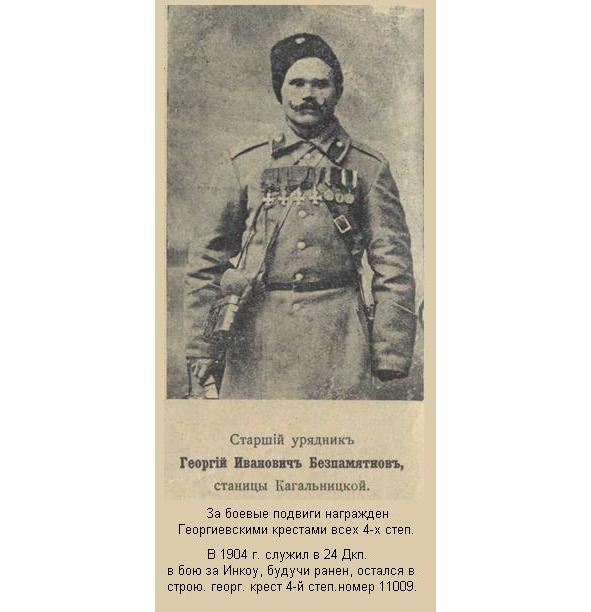 БЕЗПАМЯТНОВ Георгий Иванович (Казак станицы Кагальницкой, ОВД) — В 1904 году служил в 24 Донском казачьем полку. Участник Русско-Японской войны. Полный Георгиевский кавалер. Номер Георгиевского креста 1 ст. не установлен. Награждён ГК 4 ст. №11009: «За то, что в бою за Инкоу, будучи ранен, остался в строю».