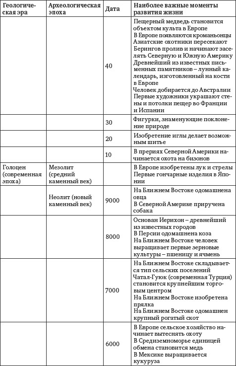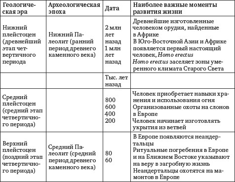 Четвертичный период Кайнозойской эры занимает особое место в геологической классификации. Он получил название антропогеновый, именно в этот период на Земле появляется человек. С этого периода возрождается археологическая периодизация, которая идет параллельно с геологической. Мы остановимся только на первых трех ее периодах: Палеолите (древнем каменном веке), который делится на нижний, средний и верхний, Мезолите (среднем каменном веке) и Неолите (новом каменном веке).
