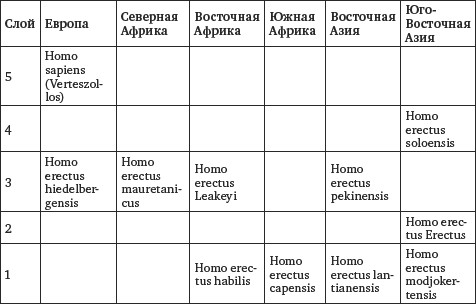 Слои и места находок ископаемого человека Homo sapiens (по У. Хоуэллсу)