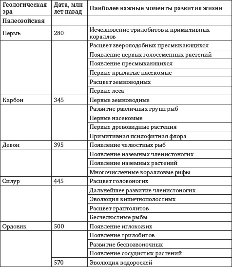 Второй геологический период – палеозойская эра (570–225 млн лет назад). В этот период появляются обширные территории суши (многие геологи предполагают, что в это время существовал единый огромный континент), многочисленные новые группы растений, первые земноводные, крылатые насекомые, пресмыкающиеся. Жизнь выходит из моря и постепенно завоевывает континент. Появляются линии жизни, ведущие к млекопитающим и в конечном счете – к человеку (таблица 2).