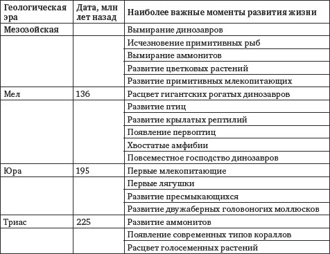 Мезозойская эра (225-65 млн лет назад) характеризовалась появлением и расцветом голосеменных растений, господством динозавров, появлением крылатых рептилий, а затем и птиц, развитием примитивных млекопитающих, рыб. В конце мезозойской эры происходят мощные тектонические процессы, изменяется климат планеты, значительные части фауны и флоры исчезают и вымирают (таблица 3).