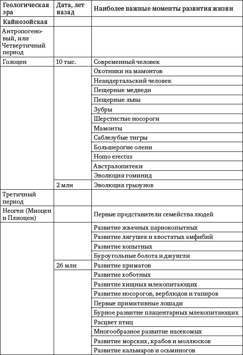 Кайнозойская эра (65 млн-10 тыс. лет назад) имеет принципиальное значение. В этот период появляются приматы, от которых в последующем произошел человек. В растительном и животном мире складываются формы и виды, которые во многих отношениях напоминают современные. Появляются первые приматы, которые дают начало эволюционной линии обезьян (таблица 4). В кайнозойской эре выделяется третичный период (65–26 млн лет назад) и четвертичный период (2 млн-10 тыс. лет назад)[5].