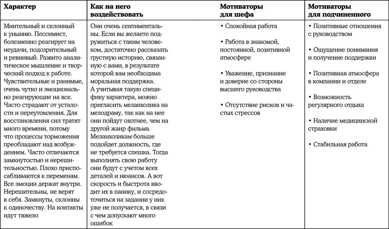 Глубина переживаемых чувств такова, что он своим настроением легко заражает всех окружающих – от мамы и жены до шефа и коллег. В ответственный момент может сломаться, испортить настроение, и соответственно пустить под откос работу всей фирмы, а семью бросить на произвол судьбы.