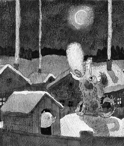 Недопёсок побежал было назад, потом – в сторону, но всюду вокруг него были заборы и дома с какими-то нехорошими трубочками, свисающими с крыш. Неожиданно выбежал он к деревенскому магазину. Уже стемнело. Над дверью магазина зажглась электрическая лампа. Поднялся ветер, и лампа со скрипом раскачивалась на проволоке под железным колпаком.