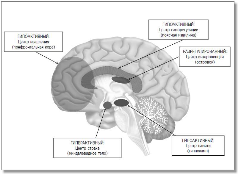 Пять ключевых областей мозга включают миндалевидное тело (центр страха), островок (центр интероцепции), гиппокамп (центр памяти), префронтальную кору (центр мышления) и поясную извилину (центр саморегуляции). Каждая из этих зон и ключевые связи между ними показаны на рисунке.