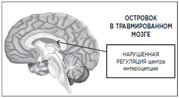 При травме часто нарушается регуляция островковой доли, что лишает людей способности чувствовать собственное тело и работать с физическими ощущениями. Например, в травмированном мозге островок может быть недостаточно активен, гиперактивен или гипер-реактивен (чрезмерно чувствителен) к изменениям внутренних ощущений. В случае чрезмерного возбуждения островковой доли возможны эмоциональная реактивность и взрывы чувств (недостаточная модуляция эмоций); если же она гипоактивна, то могут наблюдаться диссоциация и оцепенение. Обе эти крайности часто встречаются при ПТСР.