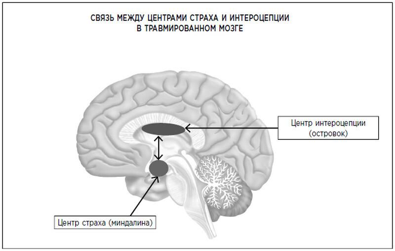 Если человек может чувствовать свое тело и связываться с внутренними ощущениями, они будут предоставлять важную информацию об испытываемых им эмоциях. Эту способность эксперт по травмам Питер Левин часто называет «контактом с переживанием» (9). Однако при травме регуляция островковой доли часто нарушается. Это состояние ограничивает способность людей чувствовать свое тело и работать с физическими ощущениями. Например, в травмированном мозге островок может быть недостаточно активен, гиперактивен или гиперреактивен (чрезмерно чувствителен) к изменениям внутренних ощущений. В случае чрезмерного возбуждения островковой доли возможны эмоциональная реактивность и взрывы чувств (недостаточная модуляция эмоций); если же она гипоактивна, то могут наблюдаться диссоциация и оцепенение. Обе эти крайности часто встречаются при ПТСР.