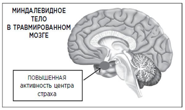Миндалевидное тело часто гиперактивно у людей с посттравматическими симптомами, а также у тех, кто страдает тревожными (и некоторыми другими) расстройствами. Если это происходит, человеку становится трудно ясно мыслить, сосредоточивать внимание, не терять самоконтроль и использовать здоровые стратегии выживания. Это также может привести к тому, что некоторые люди будут реагировать на неугрожающие ситуации, людей или другие раздражители, как если бы они были опасными. Например, если на человека в детстве напала собака и после этого у него развились посттравматические симптомы, он может начать бояться всех собак, даже дружелюбных. Это происходит потому, что миндалина начинает воспринимать всех собак как опасных. Одна из целей лечения травмы – снизить уровень активности этой области мозга. Деактивация этой зоны способна ослабить реакцию на стресс, реактивность на триггеры травмы, а также симптомы возбуждения и реактивности посттравматического стрессового расстройства (повышенная бдительность, чувство настороженности и т. д.).
