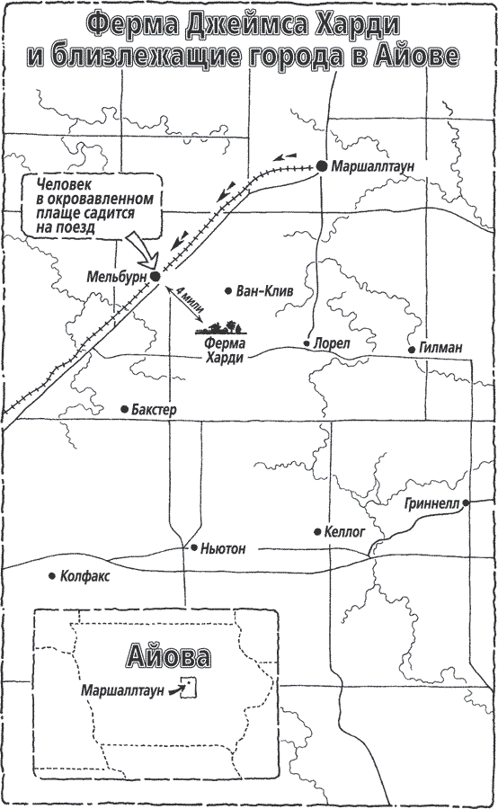 Ферма 64-летнего Джеймса Харди в Айове располагалась в безлюдной местности примерно на равном удалении от нескольких небольших городишек, которые, впрочем, назвать так можно было только с натяжкой. Это были Ван-Клив, Мельбурн, Бакстер, Ньютон, Лорел, Келлог и Люрей. Железная дорога проходила в четырех милях от фермы – за двумя исключениями это было самое большое расстояние, зафиксированное в преступлениях, о которых идет речь в данной книге. От Маршаллтауна она шла сначала на юго-запад, а затем поворачивала прямо на запад.