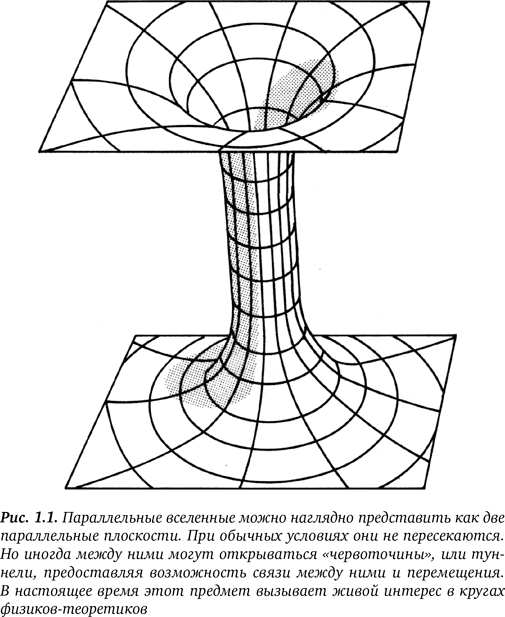 Проснувшись утром и открывая окно, чтобы впустить свежий воздух, мы рассчитываем увидеть двор своего дома. И никак не предполагаем обнаружить возвышающиеся перед нами египетские пирамиды. Подобно этому, когда мы открываем дверь, мы готовы увидеть автомобили на улице, а не кратеры и потухшие вулканы на безжизненном лунном ландшафте. Даже не задумываясь, мы подразумеваем, что можно открывать окна или двери и не опасаться, что увиденное перепугает нас до смерти. К счастью, наш мир — не фильм Стивена Спилберга. Мы действуем в соответствии с глубоко укорененным (и неизменно верным) предубеждением, что наш мир односвязный, что наши окна и двери — не входы в «червоточины», соединяющие наш дом с далекими вселенными. (В обычном пространстве веревочную петлю всегда можно затянуть в точку. Если это возможно, такое пространство называется односвязным. Но если петля помещена вокруг устья «червоточины», ее нельзя стянуть в точку. При этом веревка попадет в «червоточину». Такие пространства, где веревочные петли невозможно стянуть, называются многосвязными. Хотя изгиб нашей Вселенной в месте ее перехода в невидимое измерение экспериментально подтвержден, вопросы о существовании «червоточин» и многосвязности нашей Вселенной, по-прежнему остаются предметами научных споров.)