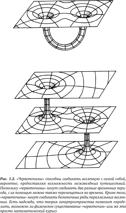 В части III мы рассмотрим вероятность растяжения пространства при чрезвычайных обстоятельствах, вплоть до появления в нем разрывов и прорех. Иными словами, гиперпространство может служить для прохождения сквозь пространство и время. Подчеркнем: все это лишь предположения, однако физики со всей серьезностью относятся к анализу свойств «кротовых нор», или «червоточин», — туннелей, соединяющих удаленные части пространства и времени. Например, физики Калифорнийского технологического института на полном серьезе предположили, что можно создать машину времени, представляющую собой «червоточину», которая соединяет прошлое с будущим. Машины времени уже покинули мир абстрактных рассуждений и фантазии и заняли законное место в сфере научных исследований.