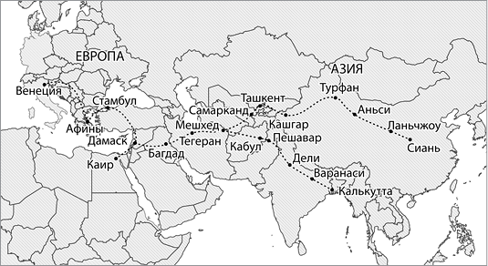 В Америку европейцы попали, ведомые желанием достичь Индии и Ост-Индии. Товары в Европу доставлялись сначала по знаменитому Великому шелковому пути (рис. 1), ведшему на запад из Индии и Китая, а далее — по Средиземному морю. В середине XV века преградой для перевозки товаров стала набирающая влияние исламская Османская империя, центр которой приходился на территорию, занимаемую современной Турцией. Османское государство сначала закрыло дорогу, а затем существенно подняло пошлины на провозимые товары. Европейцам был крайне важен этот торговый маршрут, но Османская империя взвинтила цены до невообразимого уровня.