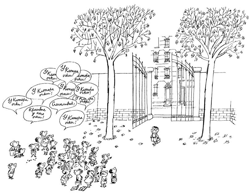 – Это всё доктор, – объяснил нам Клотер. – Он сказал моим родителям, что если я неважно учусь, то, может, это просто потому, что на уроке плохо вижу. И тогда меня отвели в магазин очков. Мсье, который занимается очками, посмотрел мне в глаза через специальный аппарат – но это совсем не больно – и заставил прочитать кучу букв – ужасную чепуху, без всякого смысла, а потом дал мне очки, и теперь – раз! – я больше не буду отстающим.