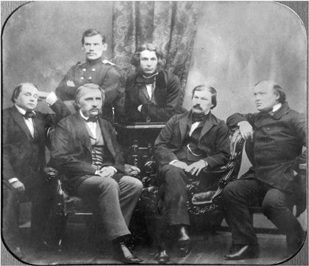 Кружок журнала «Современник». 1856 год. Сидят (слева направо): Иван Гончаров, Иван Тургенев, Александр Дружинин, Александр Островский. Стоят (слева направо): Лев Толстой и Дмитрий Григорович {2}