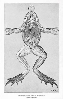 Анатомия самки травяной лягушки. Из книги Альфреда Брема «Жизнь животных». 1911 год. В романе Базаров собирает лягушек для опытов, объясняя дворовому мальчишке: «Мы с тобой те же лягушки, только что на ногах ходим» {4}