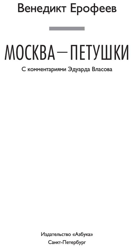 Москва—Петушки : С комментариями Эдуарда Власова / Венедикт Ерофеев, Эдуард Власов. — СПб. : Азбука, Азбука-Аттикус, 2016. — (Русская литература. Большие книги).