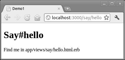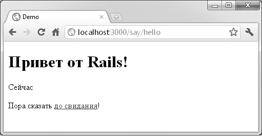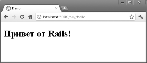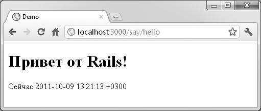 Сохраните файл hello.html.erb и обновите окно браузера. Вы увидите в нем наше приветствие:
