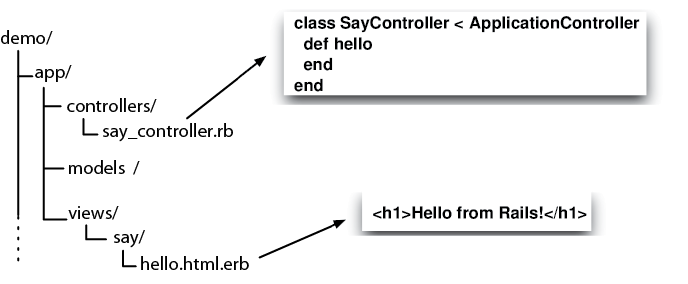 4. Rails ищет шаблон, чтобы отобразить результат. Для этого просматривается каталог app/views, в котором идет поиск подкаталога с именем, аналогичным имени контроллера (say), а в этом подкаталоге ищется файл, названный по имени действия (hello.html.erb).