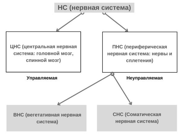 Первый — это ЦНС — центральная нервная система, к которой относятся головной и спинной мозг. Это управляемая нами система.