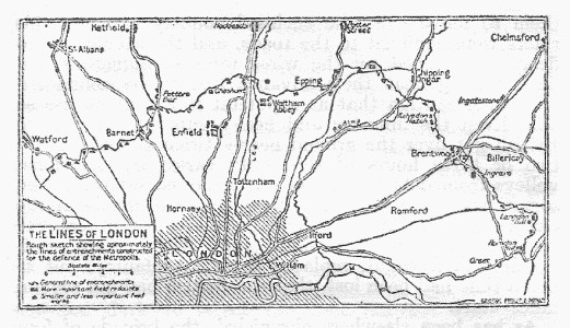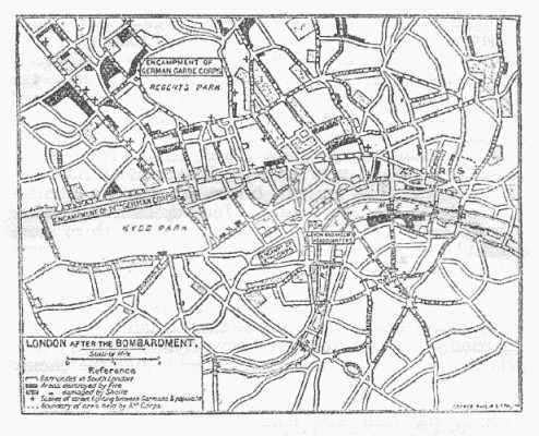 Though London lay crushed and occupied by the enemy, though the Lord Mayor was a prisoner of war and the banks in the hands of the Germans, though the metropolis had been wrecked and more than half its inhabitants had fled southward and westward into the country, yet the enemy received no reply to their demand for an indemnity and the cession of British territory.