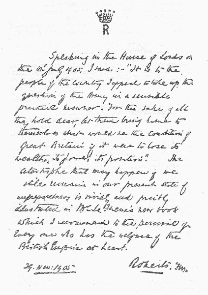 This was the keynote of a solemn warning made in the House of Lords by Earl Roberts. His lordship, whilst drawing attention to our present inadequate forces, strongly urged that action should be taken in accordance with the recommendations of the Elgin Commission that "no military system could be considered satisfactory which did not contain powers of expansion outside the limit of the regular forces of the Crown."