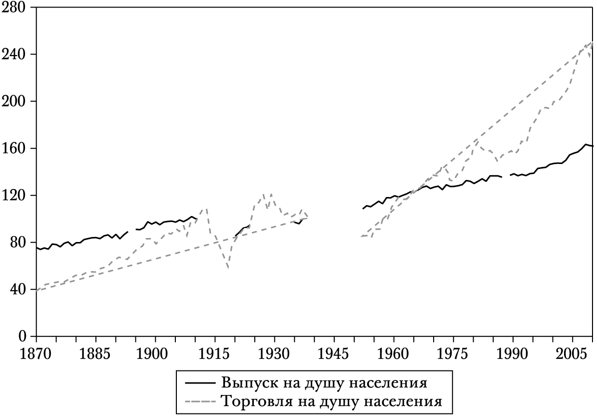 Рост мировой торговли в первое глобальное столетие выглядит весьма впечатляюще. В течение первых шести десятилетий до 1913 года ее объем рос на 3,8% в год, намного опережая темпы роста ВВП. В результате доля торговли в мировом ВВП увеличивалась. Из этого можно заключить, что повышение дохода, индустриализация, революция в сфере транспортных перевозок, совершенствование средств связи и либерализация экономической политики дополняли и усиливали друг друга. Какой из этих факторов был самым важным? Ответ зависит от того, возьмем ли мы за главный показатель степень интеграции рынка, долю торговли в ВВП или сам объем торговли. Если мы сосредоточимся на объемах торговли, тогда самую важную роль играл рост дохода, который, в свою очередь, происходил благодаря углублению и расширению капитализма. Если же за главный показатель взять долю торговли в ВВП и степень интеграции рынка, то наибольшее влияние оказало падение таможенных и транспортных преград, которое отчасти было результатом политики ведущих капиталистических стран, поощрявших глобализацию.