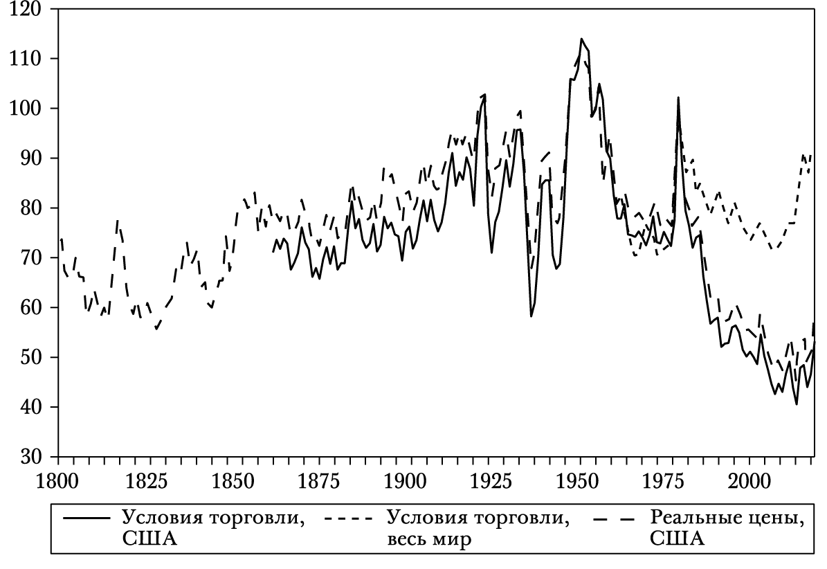 Оба индикатора относительных цен рисуют схожую картину. В период перед Первой мировой войной цены более или менее постоянно увеличивались, затем, во время войны в Корее, они достигли исторического максимума, после чего начали движение вниз, прерванное лишь коротким всплеском в 1970-х годах. Очевидно, что тенденции в США могут быть нетипичными, однако предварительные выводы на их основе подтверждаются ввиду дополнительных данных по другим странам. В первые десятилетия XIX века индекс реальных цен и условий торговли повышался в большинстве развитых европейских стран, за одним важным исключением (Великобритания). Кроме того, у многих стран периферии повысился индекс условий внешней торговли, то есть отношение между ценами на их экспорт — в основном сельскохозяйственный — и ценами на их импорт, в основном промышленный (Williamson 2011). Он увеличился очень сильно у стран европейской периферии (Италии, Испании, России), Ближнего Востока и Юго-Восточной Азии (Индонезии), чуть слабее — у Латинской Америки и Южной Азии (Индии и Цейлона), у Китая он не изменился, а Япония оставалась закрытой для мировой торговли до 1859 года. После 1870 года тенденции стали более разнонаправленными. Внутренние условия торговли продолжили улучшаться в большинстве стран, однако реальные цены на сельскохозяйственные товары застыли на неизменном уровне или даже снижались.