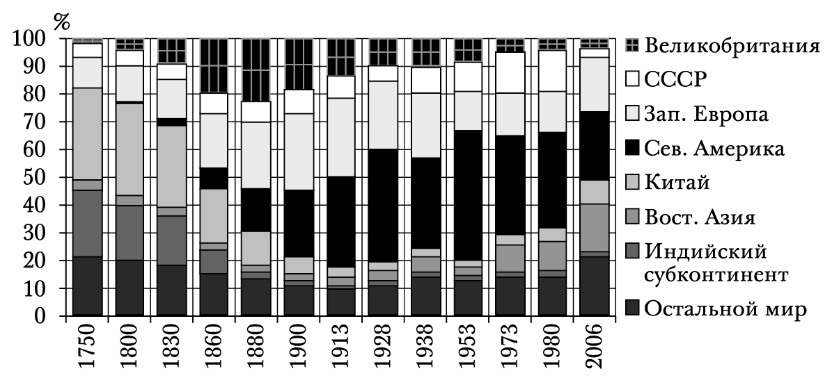 Восточноазиатские тигры, а за ними Китай своими темпами роста конца XX века задали настолько высокую планку «экономического чуда», что на их фоне меркнут прошлые эпизоды быстрого роста. Однако по стандартам своего времени первое «чудо экономического роста», запущенное промышленной революцией в Западной Европе и англоговорящих колониях, было чем-то поистине выдающимся: за первое глобальное столетие, завершившееся в 1913 году, темпы роста поднялись почти в четыре раза. Легко недооценить масштаб изменений, ведь даже в наиболее богатых странах большинство населения по-прежнему состояло из крестьян, живущих экономически самодостаточными хозяйствами, зачастую практически оторванными от рынков. Это означает, что темп роста экономического «излишка» по сравнению с продуктом, необходимым для физического выживания, подскочил, скорее всего, намного более, чем в четыре раза. А именно рост этого излишка и способствовал продвижению торговли. Действительно, доля торговли в мировом ВВП в период с 1820 по 1913 год выросла в восемь раз.
