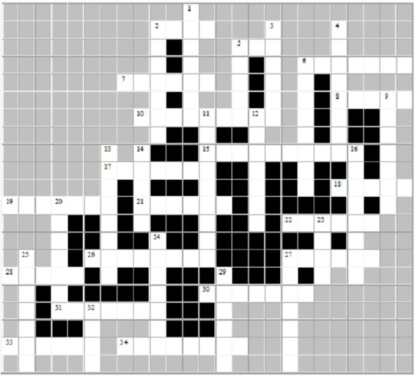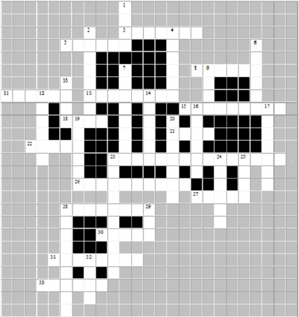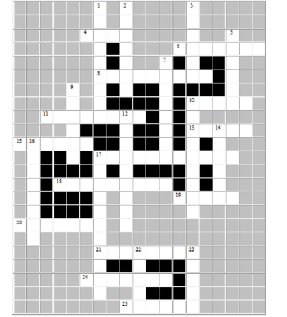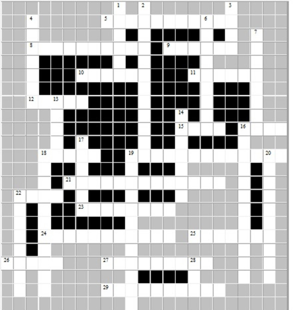 По вертикали: 1. Крупное земельное владение. 2. Римский комедиограф. 4. Жена римского полководца Германика. Сопровождала его в походах в Германию и на Ближний Восток. Имела 9 детей, среди них император Калигула и Агриппина Младшая. Была отправлена Тиберием в ссылку за то, что обвинила его в отравлении своего мужа. В ссылке покончила с собой. 6. Сооружение для зрелищ, в котором места для зрителей располагались вокруг арены, возвышаясь по кругу. 7. То же, что и кавалерия. 9. Царь Альбы Лонги, свергнутый с престола своим братом Амулием; дед Ромула и Рема, которые вернули ему свободу и царскую власть. 11. Выдающийся римский историк, автор небольших сочинений «Беседа об ораторах», «Агрикола», «Германия» и двух монументальных исторических трудов: «История» в 12 книгах и «Анналы» в 18 книгах. 13. Латинская форма имени Одиссей. 14. Спор при обсуждении научных, литературных, политических вопросов. 15. Раб, отпущенный на свободу или выкупившийся, но остававшийся в разной степени зависимости от бывшего владельца. 16. Римский император, племянник императора Юстина. 20. Римский император в 284 — 305 гг. 22. Одна из 9 муз, покровительница трагедии. 23. Один из главных государственных органов в Древнем Риме. 25. Обязательная плата в пользу государства. 28. Остров в Средиземном море, к западу от Апеннинского полуострова. 29. Карфагенский полководец. Сын Гамилькара Барки. В ходе второй Пунической войны совершил переход через Альпы, одержал победы у рек Тицин, Треббия, у Тразименского озера и при Каннах. 30. Христианский храм. 31. Родина Иисуса Христа. 32. Высшее духовное звание в христианской церкви. 33. Герой античной литературы; беглый раб, спасавшийся в течение трех лет в одной пещере с вылеченным им львом.