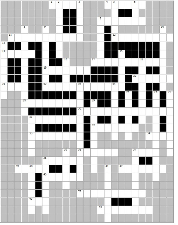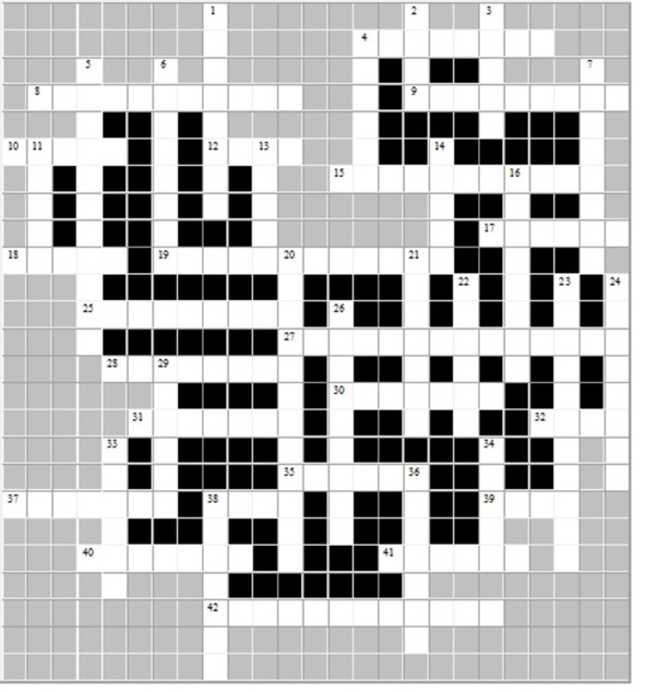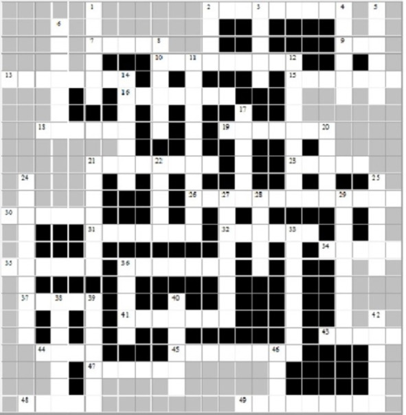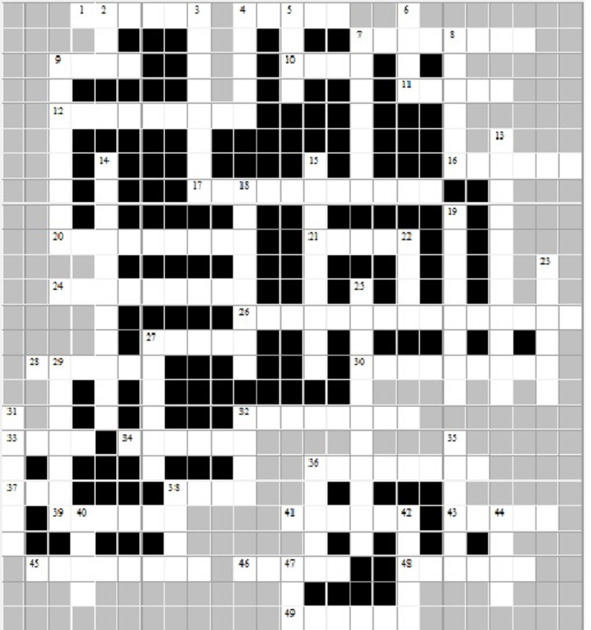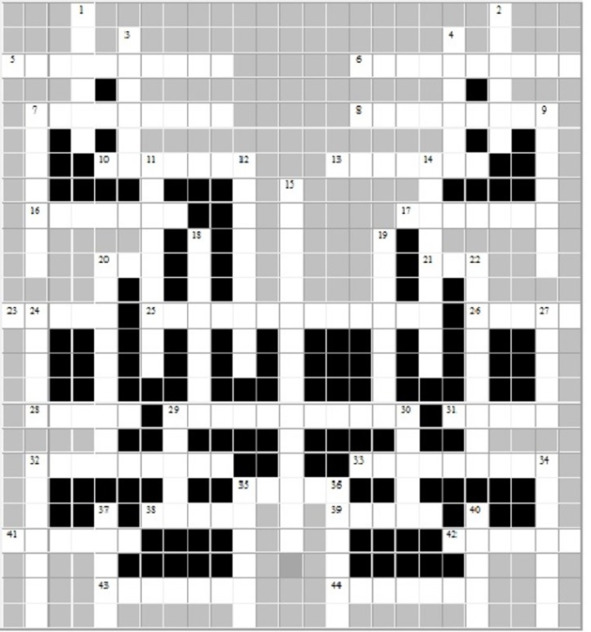 По вертикали: 1. От латинских слов «вода» и «веду» — водопровод. 2. Действия и слова, якобы обладающие чудодейственными свойствами. 3. Мелкая монета в Древней Греции. 4. Животное, объект религиозного поклонения древних египтян. 5. Цвет короны царя Южного Египта; символический цвет варны брахманов. 7. Современное государство в Юго–Западной Азии. 8. Участник состязаний, человек крепкого телосложения, силач. 9. Мировая религия наряду с христианством и исламом. 11. Древнегреческая поэтесса. 12. Люди, стоявшие вне варн, неприкасаемые. 16. Пограничная полоса между сушей и морем. 17. В переводе с латыни означает «налагаю запрет», «запрещаю». 18. Домашнее животное. 19. Супруга Александра Македонского. 21. Человек, занимающий низшее положение в индуистском обществе. 23. Материальные ценности, имущество, принадлежащие кому–нибудь или находящиеся в полном распоряжении. 24. Поэтический цикл Вергилия. 25. Высшая ступень познания. 30. Стойкость и неизменность в чувствах, отношениях, в исполнении своих обязанностей, долга; одна из пяти основных добродетелей, проповедовавшихся Конфуцием. 31. Дар хорошо и красиво говорить. 32. Общество, достигшее высокого уровня развития. 34. Пища, дающая бессмертие и вечную юность. 38. Внутренний мир человека. 39. В Древней Греции с ней отождествляли победу. 40. Жена римского полководца Германика. Сопровождала его в походах в Германию и на Ближний Восток. Имела 9 детей, среди них император Калигула и Агриппина Младшая. Была отправлена Тиберием в ссылку за то, что обвинила его в отравлении своего мужа. В ссылке покончила с собой. 42. Представитель власти в римской провинции. 44. Название многочисленных древнегреческих городов, образованное от имени «Геракл». 46. Римский император