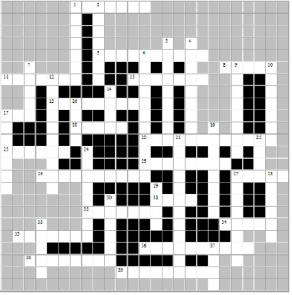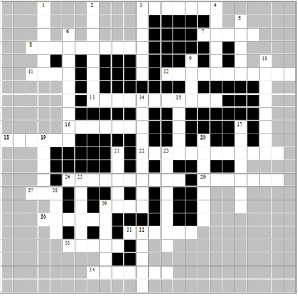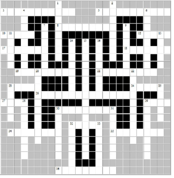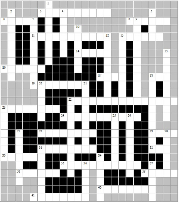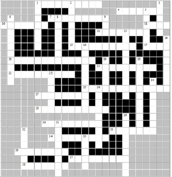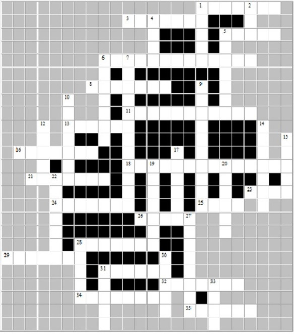 По вертикали: 1. Вера в сверхъестественное, таинственное, в предзнаменования, в приметы. 2. Торжественная песнь. 3. Поэтический цикл Вергилия. 5. В древнеримской мифологии: бог войны; то же, что в древнегреческой Арес. 6. Древнеримская баня. 8. Сооружение для зрелищ, в котором места для зрителей располагались вокруг арены, возвышаясь по кругу. 9. Один из основных элементов религии. 10. Памятник древнеримской архитектуры, «храм всех богов». 12. Римский комедиограф. Создал характеры-маски в стихотворных комедиях «Ослы», «Горшок», «Хвастливый воин» и многих других. 14. Римский оратор, теоретик красноречия и философ, государственный деятель, поэт, писатель и переводчик. 16. Античная (древнегреческая, римская) двухколесная колесница, запряженная четверкой лошадей в один ряд. 18. Наука о прошлом человечества. 19. «Любовь к мудрости». Наука о наиболее общих законах развития природы, общества и мышления. 21. Поэма Овидия. 22. Римский поэт, автор шестнадцати сохранившихся гекзаметрических «Сатир», распределенных по пяти книгам. 24. Частная гимнастическая школа в Древней Греции для обучения мальчиков 12 — -16 лет. 27. Сжатое изложение событий по годам. 31. Виды пшеницы с ломким колосом и не вымолачиваемым из пленок зерном. 34. Дугообразное перекрытие проема в стене или пролета между двумя опорами.