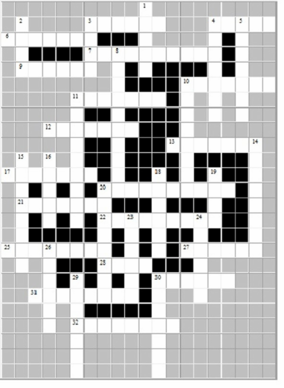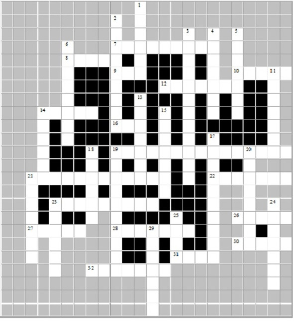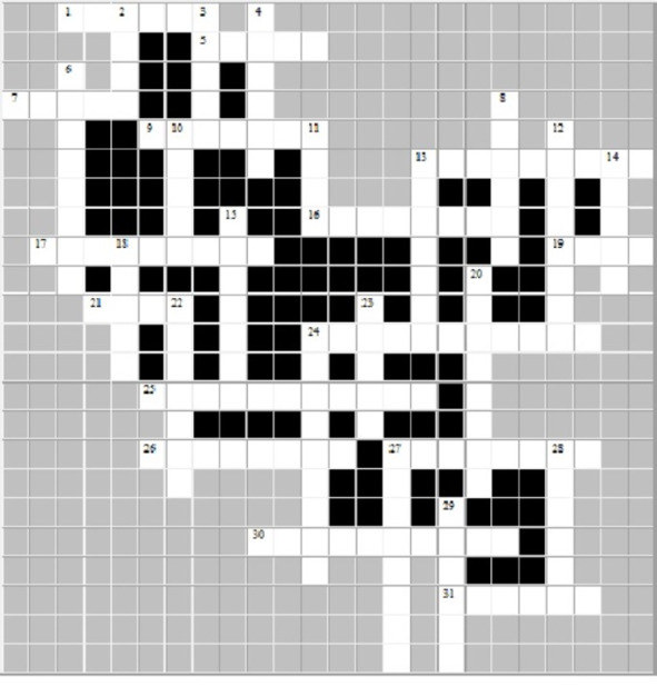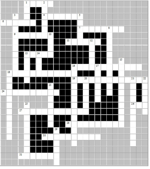 По горизонтали: 1. От латинских слов «дорога» и «веду» — мост через глубокий овраг, ущелье, дорогу и т. д. 5. Латинская форма имени Одиссей. 7. Супруга Юпитера, покровительница римских матрон. 9. Наука о прошлом человечества. 13. Сооружение для зрелищ, в котором места для зрителей располагались вокруг арены, возвышаясь по кругу. 16. Вера в сверхъестественное, таинственное, в предзнаменования, в приметы. 17. «Любовь к мудрости». Наука о наиболее общих законах развития природы, общества и мышления. 19. Торжественная песнь. 21. Служитель богов. 24. Дар хорошо и красиво говорить. 25. Поэма Овидия. 26. Спор при обсуждении научных, литературных, политических вопросов. 27. Здание, разделенное внутри рядами колонн на отдельные части. 30. Одна из 9 муз, покровительница трагедии. 31. Сжатое изложение событий по годам.