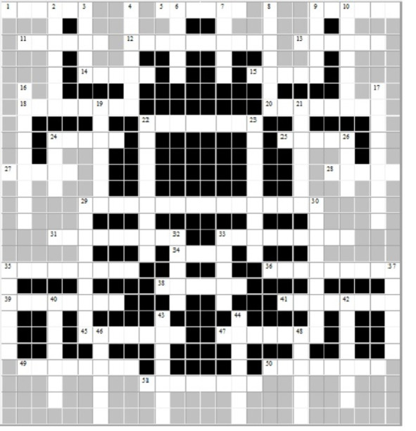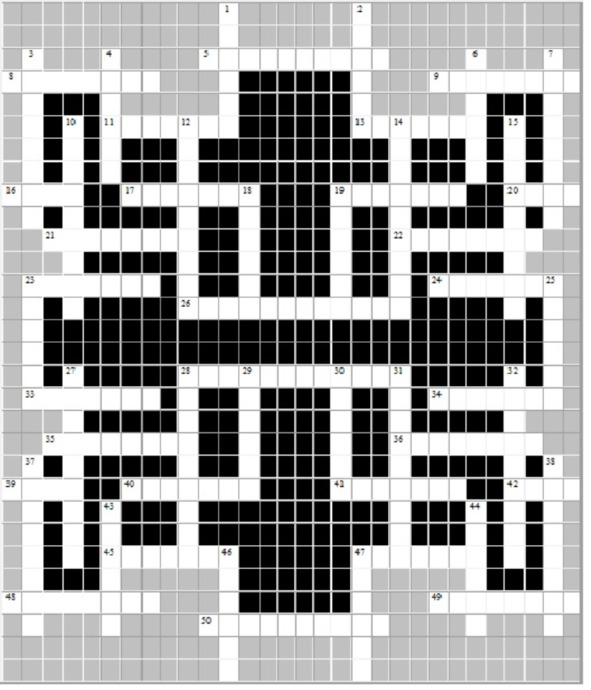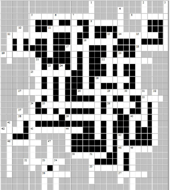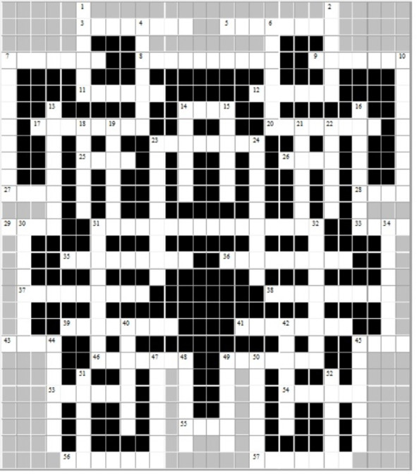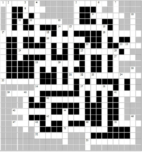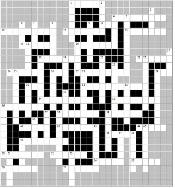 По вертикали: 1. От латинских слов «дорога» и «веду» — мост через глубокий овраг, ущелье, дорогу и т. д. 2. Самый известный из римских гладиаторов. 3. Обширный союз восточногерманских племен. 4. В переводе с латыни означает «знатный», «благородный». 6. Римский император. Последовательно проводил централизацию государственного аппарата, поддерживал христианскую церковь, сохраняя также языческие культы. 8. Один из основных элементов религии. 9. Древнеримская баня. 11. Римский император в 284 — 305 гг. 12. В переводе с латыни означает «домочадцы» — во всех европейских языках этим словом обозначают семью. 13. Член богатого и знатного рода в Древнем Риме. 17. Жена римского полководца Германика. Сопровождала его в походах в Германию и на Ближний Восток. Имела 9 детей, среди них император Калигула и Агриппина Младшая. Была отправлена Тиберием в ссылку за то, что обвинила его в отравлении своего мужа. В ссылке покончила с собой. 20. Медлительный, нерешительный человек. Прозвище римского императора Квинта Фабия Максима за его крайне осторожные и нерешительные действия в войне с Ганнибалом. 21. Воин легиона. 22. Карфагенский полководец. Сын Гамилькара Барки. В ходе второй Пунической войны совершил переход через Альпы, одержал победы у рек Тицин, Треббия, у Тразименского озера и при Каннах. 24. Состояние полной зависимости, подчиненности. 26. Древние племена Италии. 27. В Древнем Риме завоеванная территория, которая управлялась римским наместником. 28. Часть Библии, содержащая жизнеописания и учение Иисуса Христа. 32. Поэтический цикл Вергилия. 33. Бессмысленное уничтожение культурных и материальных ценностей. 34. Самый крутой из семи холмов Древнего Рима, укрепленная часть города. Здесь в храме Юпитера происходили иногда заседания сената, а при храме Юноны (Монеты) Советницы в «замке» была мастерская, где чеканились деньги. 36. Родной сын императора Клавдия, так и не ставший императором. 40. Название дней, считавшихся благоприятными для ведения государственных дел; позднее — название римского календаря. 41. Апостол, один из величайших проповедников христианства, прозванный «апостолом язычников». 45. Римский оратор, теоретик красноречия и философ, государственный деятель, поэт, писатель и переводчик. 47. Римский поэт. Его знаменитый «Памятник» породил множество подражаний. 48. Пролив между Европой и Азией, соединяет Черное и Мраморное моря. 49. Второе имя императора Октавиана, в переводе с латыни означает «Возвеличенный богами». 50. Первый варварский король Италии. Дата его пришествия к власти традиционно считается датой гибели Западной Римской империи. 51. Должностное лицо, ведавшее оценкой имущества граждан, следившее за поступлением налогов и за общественной нравственностью. 53. Смесь цемента с водой, песком и щебнем, твердеющая после укладки. 54. Имя этого царя связано с происхождением названия племени латинян.