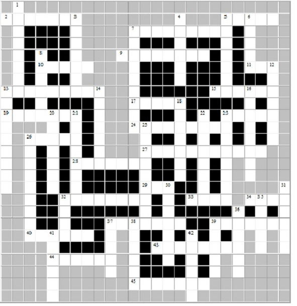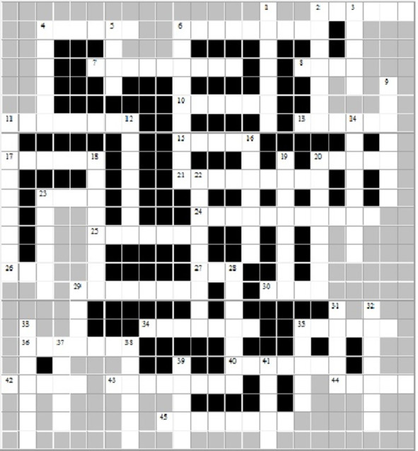 По вертикали: 1. Один из главных троянских героев, старший сын царя Трои Приама и Гекубы; погиб в единоборстве с Ахиллом, мстившим за убийство его друга Патрокла. 2. Древний город в Малой Азии, южнее которого в 333 г. до н. э. войска Александра Македонского вторично, после победы при Гранике, разбили персидскую армию царя Дария III Кодомана. 3. Невольник. 4. Древнегреческий софист, вел жизнь странствующего учителя и часто выполнял посольские миссии своего родного города. 7. Собрание книг, а также помещение, где они хранятся. 8. Полуостров и историко-географическая область на юге Греции. 9. Учение о мире невещественном, духовном, о том, что выше физики, т.е.земной природы, что не подлежит чувствам человека, а только умствованию его (умозрению). 10. Искусство художественного чтения стихов или прозы. 13. Одна из нереид, богиня моря, супруга Посейдона. 15. «Любовь к мудрости». Наука о наиболее общих законах развития природы, общества и мышления. 19. Народное собрание в Древней Греции, а также площадь, где оно происходило. 21. Древний город на северо-западе Малой Азии. Известен по греческому эпосу. Другое название — Троя. 25. Изготовление каменных и металлических изделий, посуды, тканей. 26. Афинский оратор, публицист, противник демократии, сторонник объединения Греции под главенством Македонии для совместного завоевательного похода против персов. 30. Древнегреческая эпическая поэма, приписываемая Гомеру, литературный памятник мирового значения. 32. Глава греческой колонизационной экспедиции. 35. Страна, расположенная в северо-восточной части Африки. 36. Река на северо-западе Малой Азии. Здесь Александр Македонский в 334 г. до н. э. одержал победу над персами. 38. Напиток, дающий бессмертие и вечную юность. 39. Фрукт с надписью «прекраснейшей», подброшенный богиней раздора Эридой на свадебном пиру; послужил причиной спора между богинями Герой, Афиной и Афродитой. 40. Хлебный злак, обычно яровой. 41. В переводе с греческого означает «предводитель», «начальник». 43. В греческой мифологии царь Аттики; от его имени, как полагали древние греки, происходит название Эгейского моря, т. к. он бросился в это море при известии о смерти своего сына Тесея (известие оказалось ошибочным). 45. В греческой мифологии бог коварной, вероломной войны, сын Зевса и Геры. Ему соответствует римский Марс.