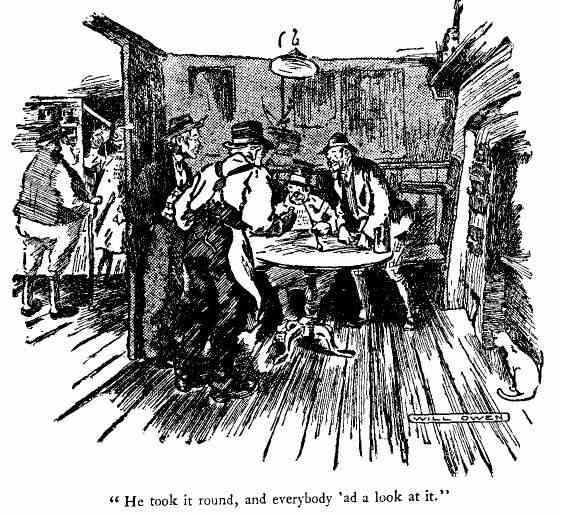 The landlord 'ad just that moment come in, and Peter walked up and ordered a pint, and took his ten-pence change as bold as brass. Arter that Joe Barbcomb bought five more ha'pennies afore you could wink a'most, and every man wot sold one went up to the bar and 'ad a pint and got tenpence change, and drank Joe Barlcomb's health.