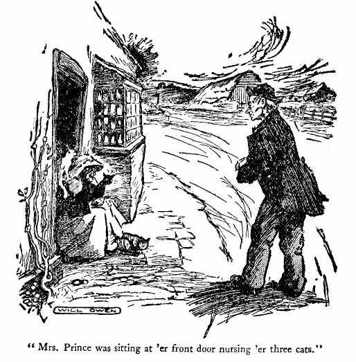 Mrs. Prince was sitting at 'er front door nursing 'er three cats when 'e got there. She was an ugly, little old woman with piercing black eyes and a hook nose, and she 'ad a quiet, artful sort of a way with 'er that made 'er very much disliked. One thing was she was always making fun of people, and for another she seemed to be able to tell their thoughts, and that don't get anybody liked much, especially when they don't keep it to theirselves. She'd been a lady's maid all 'er young days, and it was very 'ard to be taken for a witch just because she was old.