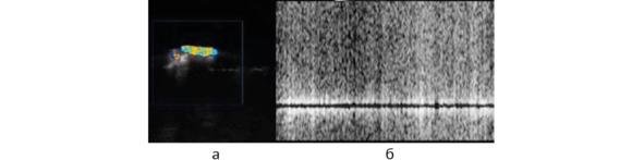 Но в некоторых случаях артефакты могут быть использованы в качестве дополнительного диагностического признака [20], в частности, именно это следует сказать про доплеровский мерцающий артефакт (англ. twinkling artifact) [21–29]. В режимах, связанных с цветовым картированием кровотока, он выглядит как скопление быстроменяющихся окрашенных пикселей (рис. 1 а), появляющееся в тех местах, где движение крови заведомо отсутствует. В спектральных режимах мерцающий артефакт приводит к возникновению широкого «белого» спектра (рис. 1 б); громкоговорители прибора при этом воспроизводят шум большой интенсивности.