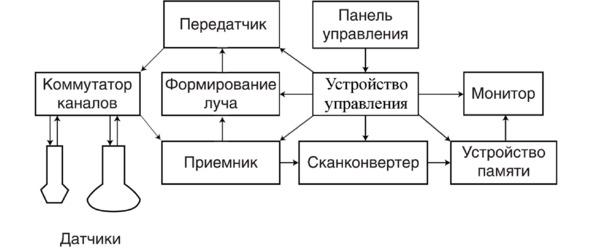 Как видно из схемы на рис. 2, на входе прибора стоит коммутатор, к которому подключаются датчики через специальные разъемы. Коммутатор обеспечивает переключение датчиков по командам с панели управления. Кроме того, он перемещает УЗ-луч в датчиках линейного и конвексного типов. Команды о необходимости такого перемещения поступают из устройства управления, которое также координирует работу формирователя луча, передатчика, приемника, сконконвертера, устройства памяти и монитора.