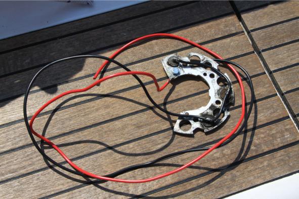 Что-то не то с зарядкой аккумуляторов — напряжение упало и перекос по аккумуляторам. Вроде всё сделали, и вот опять, блин. Уже в ЯК выясняем, что в генераторе полетел диод — при разборке это стало видно. ЧТО ДЕЛАТЬ? Диоды здесь стоят 40А, таких уж точно нет, да и менять — запрессовывать в подкову? Идем на свалку, благо они у нас вокруг, находим старый генератор, разбираем и снимаем нужную подкову, соединяем три диода параллельно, а они тут по 20А, и длинными проводами впаиваем вместо сгоревшего диода, ставим генератор, а подкову вешаем на стенку переборки на счастье! Теперь у нас уже висит две подковы.