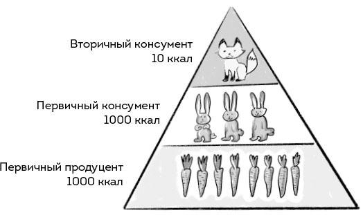 Мы уже затрагивали вопрос эффективности фотосинтеза. Дело в том, что при такой передаче солнечной энергии от растений к животным, а от них к другим животным и далее по цепочке, неизбежны потери в виде выделения тепла, метаболизма и других процессов. И исходя из этого был сформулирован закон (хотя автор не называл бы это законом, но так закрепилось) Раймонда Линдемана, или Закон 10 % [18]. Согласно ему при переходе энергии от одного уровня к другому передается лишь около 10 %. Остальное теряется в процессе переноса.