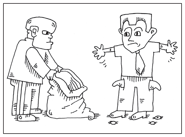Итак, приходит к процентщику землепашец и просит в долг один рубль, для покупки семян. Ведь, посеяв одно зернышко, он рассчитывает получить к осени двадцать – расчет верен и понятен. «Хорошо, – говорит Авраам, – я дам тебе этот рубль, но ты за это осенью мне отдашь кроме него еще один рубль – как плату за кредит. Плату за неумение распоряжаться своими деньгами – вот у меня рубль есть, а у тебя нет». Ударили по рукам, утвердив взаимовыгодные условия сделки! Крестьянин после сбора урожая вполне способен отдать еще одну стоимость с продажи зерна. Да и кредитор в выгоде – просто сидя на скамейке, заработает через полгода целый рубль[3]. «Постой Иван, – говорит далее банкир, – чтобы ты меня не обманул, оставь мне в залог свой топор стоимостью в рубль». Отдал крестьянин топор, ведь деньги-то нужны для посевной. «Послушай Иван, – молвит дальше Авраам, – если летом будет засуха, ты же не сможешь вернуть мне заем. Так что отдай мне заранее проценты по кредиту». Отдал Иван этот процентный рубль, только что полученный на руки, и задумался: а что я сейчас имею? Денег у него на посевное зерно не осталось, да и своего личного топора он лишился.