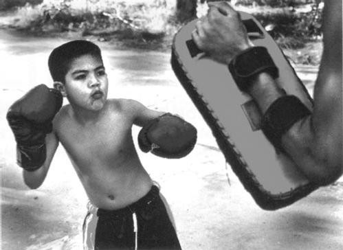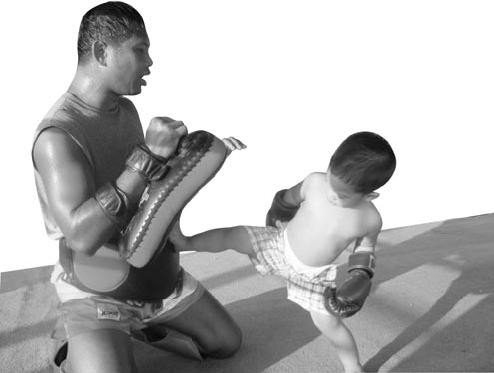 На детей начинают обращать внимание, когда им исполняется 7-8 лет. Количество внимания зависит исключительно от того, насколько ученик владеет техникой муай тай и насколько добросовестно относится к тренировкам. Кроме того, большое значение имеет, обладает ли он определенными способностями. К этому времени дети уже имеют довольно устойчивые и объективные представления о муай тай, а также обладают определенными умениями и навыками. Тренеры начинают уделять время наиболее перспективным и старательным детям, давая методические указания при работе в парах и на мешках. Периодически младших берут для работы на лапах. Это считается большой честью и похвалой. С детьми работают очень терпеливо, добиваясь правильного выполнения приема. При работе на лапах и мешках малышам дают установку на нанесение ударов с максимальной силой. От них не требуют высокого темпа: удары наносятся редко, но очень качественно (рис. 1.3). Начиная с 8-9 лет детям разрешают участвовать в спаррингах. Для этого их экипируют большими мягкими перчатками.